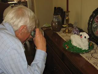 There was much discussion of the traditional lamb cake. Notice the hole in its head? When we arrived, there was a giant steel skewer holding the whole thing up. Bampa referred to the hole as its lobotomy scar. Then he 'repaired' it with his finger. Henry added the jellybean face.